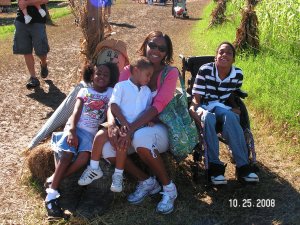 Today Maurice and I took the kids to the Pumpkin Festival. It was an hour from the city and the kids were thrilled with all the cows and horses that were seen during the ride. Natalie walked through a hay maze (Kobe refused) and rode a pony (Kobe refused). Victoria, Jordan, and Chrisitan found their way through a corn maze. It took them about 30 minutes. Tres had to stick with us, the ground was so muddy only Maurice could push his wheelchair!