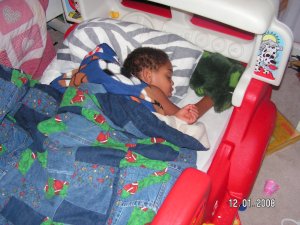 I am happy to report that Kobe is now consistently sleeping in his own bed!!! We did have to change a few things. We originally put him in with his brothers. Im not sure if he felt he was too far away from us or if he just meshed better with Natailie, but he would not stay in the boys room. So we moved his car bed into Natalie’s room. Her room is already small so it has been trying walking around the beds to get to anything needed. He slept in her room without fuss. He has established his own routine. We read a book, kiss good night, and wrap him cacoon style in his blanket. If in the middle of the night he unwraps and realizes it, he comes to our room so we can re cacoon him. I was so tired a couple of nights I told him just to climb in our bed…he refused. He wanted to get back in his bed! Now the next step is getting his bed from Natalie’s room back in to the boys room!