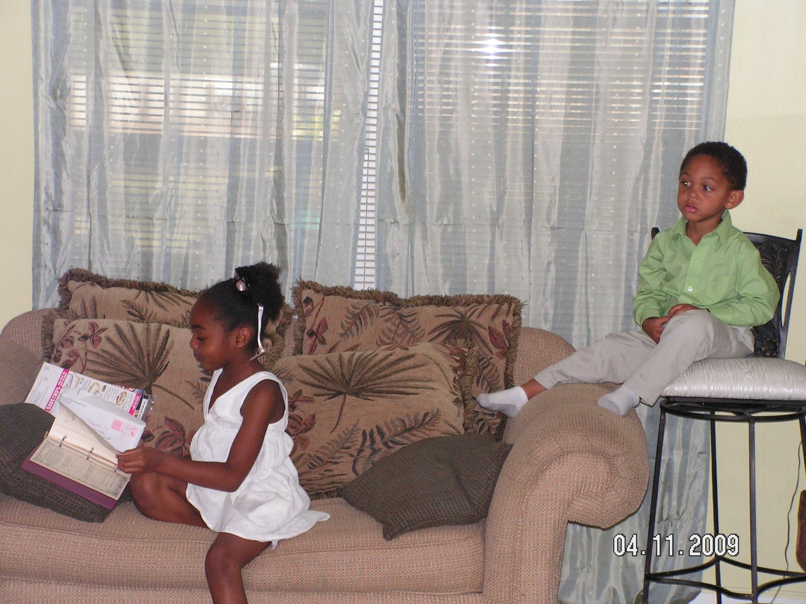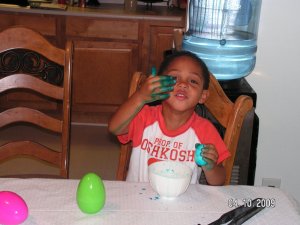 We spent the day before Easter dying eggs(again)with Tab and Journey. Journey was more interested in how the eggs tasted. Jordan had enough dying for one season and declined the activity. The kids went to church Sunday all dressed up in their new duds that were accessorized with purple and yellow stained hands. After church Natalie could not get out of her “itchy” dress quickly enough. Kobe’s tie came off on the way to the car. My philosophy is as long as they look cute going in, I won’t fuss about how they look going out. LOL