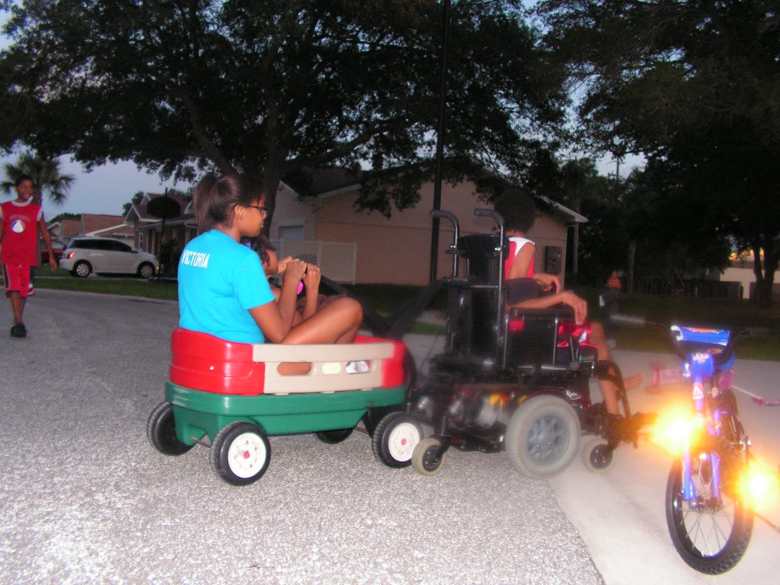 The kids decided it would be a great idea to take a rope, tie it up to the wagon, then tie it to Tres wheel chair. Tres then wheeled them up and down the street. Tres was not fast enough so they thought it would be more fun if Jordan pushed the wagon from behind and raced Tres. In the middle of all of that fun Tori and Natalie both fell out of the wagon and skinned there knees. Another good idea gone bad.