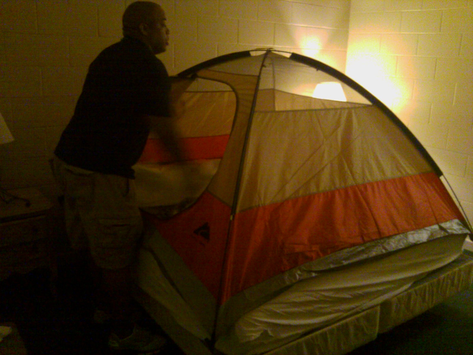 The couple’s ministry at our church went on a retreat at a beautiful, nature filled lakeside getaway. It was so nice and quiet. We looked over our itinerary and it was packed with activities like couples volley ball, nature trails, game nights and learning sessions. As we walked to our room I started getting the hi bi jibes as Maurice walked in front of me so he could pull down all the spider webs. When I looked up at the balcony overhang near our room there were (I’m not exaggerating) about 40 spiders. Ok, we were at a retreat in a nature preserve so of course there are spiders. No big. We get in our room and we let out a sigh of relief. It looked just like a hotel room. Nice and clean, no cobwebs that we could see. We left to meet the group for dinner at the dining hall (which was very nice by the way..full buffet and 3 courses)as we were walking we kept stepping into spider webs that were hanging from trees. We went down to the lake and there next to the rail was the biggest spider Maurice and I have ever seen.(pictured above) All of the activities took my mind off of the creepy little critters until that night when we went back to our room. No sooner had I stepped out of the bathroom ready to go to bed when a black, harry, size of my husbands palm spider crawled from under the bed. Ok…when a spider is big enough to make my 6’3, 250 lbs hubby scream like a girl you know it is way to big. I lost it. No more being optimistic. WE HAD TO GO! I reasoned with Maurice. I remembered seeing a hotel on our way to the retreat. We could check in and sleep there at night and none of the other couples would have to know. He was cracking up at me…I was very serious. Finally after brain storming with Tori over the phone we decided at 1:00 am to go to Wal-Mart and buy a tent. As long as I was zipped up I felt safe and could get a good night sleep. I was very careful each day about re zipping the tent before we left for activities. We never did see another spider in the room but that did not matter to me. Oh and besides the arachnoid’s…the retreat was fantastic and Maurice and I got some much needed couple time.