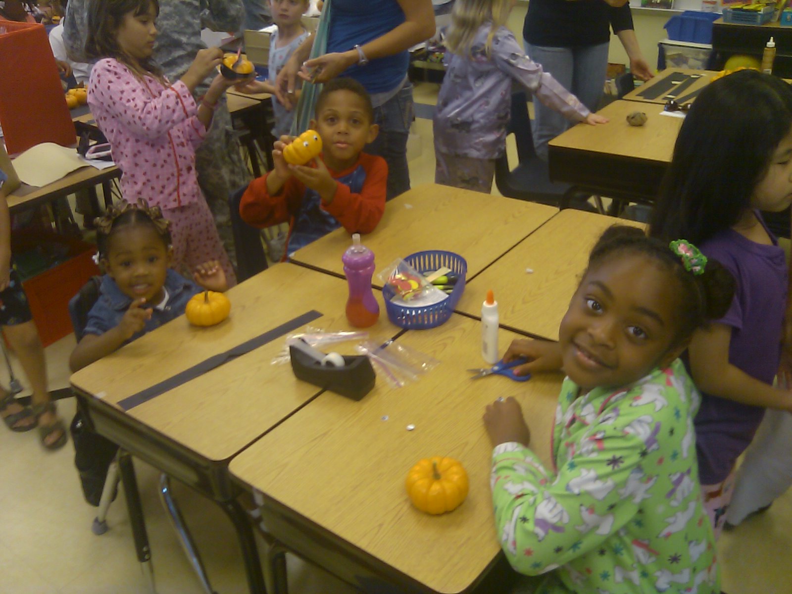 jammies? The kids school had it right when they held a fall festival with games, arts and crafts and pumpkin painting all in p.j.’s! So much fun and no stain worries. Tab and Journey accompanied us. The kids took their masked pumpkin creations very seriously. The bottom picure is of Kobe and his teacher Ms. Bell who was also Natalie’s kindergarten teacher.