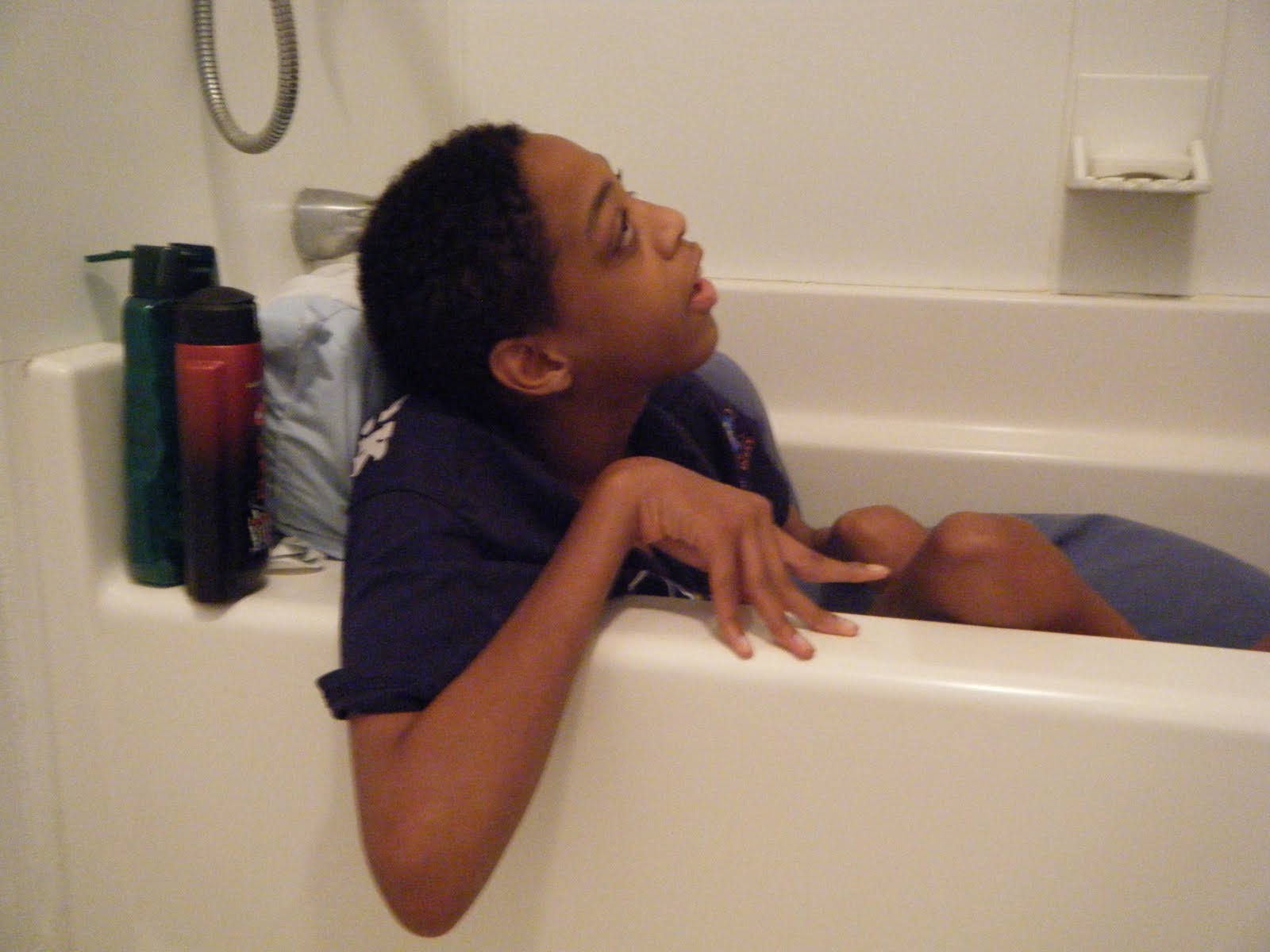 March 31 was one crazy day for those of us in Tampa. We had been told very early by our Meteorologist that a nasty storm would be heading our way. It is so erie how they can tell you almost the exact minute that a storm is going to hit your area. So the morning started as we watched the news and tracked the storm. Tori is 45 minutes away and we talked on the phone as the storm passed her school. She was standing with other students in front of a huge window watching it. “This is the scariest storm I have ever seen Mom! You should see the trees bending.” Nice. Right as I heard Mr. Weatherman announce that the storm should be hitting Tampa with in the next few minutes I heard the howling of the winds. As I ran in the bathroom to throw pillows into the tub just in case we needed them I was sending out prayers of protection for all my babies at school and Maurice at work. I can not stand to be apart during situations like this. The hubster called telling me a funnel was spotted nearby and we should get to the bathroom. I got to Tres room, hauled him out of bed and put him in the tub. Once it seemed to calm down I pulled Tres out of the tub and placed him in his wheelchair for breakfast. Right as I placed his plate on his tray we heard the tornado sirens. Whisking him out of his chair we headed for the bathroom again. Way too much strenuous activity within a few hours. Later as we watched the news we seen the pictures of the damage that was caused by the storm. Pictured above is poor Tres sitting in the bathtub he visited a little to much that morning.