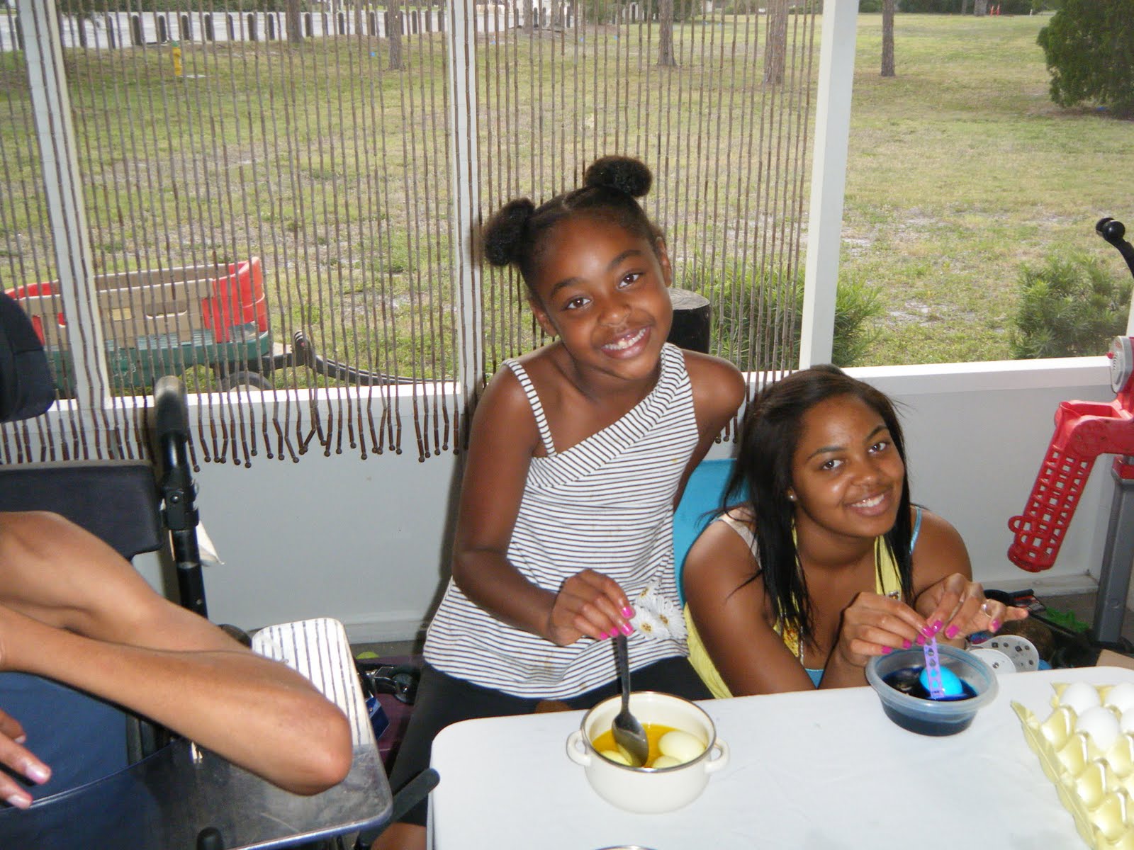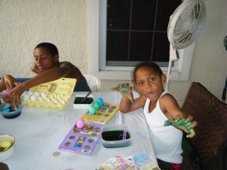 What a blessed weekend we had leading up to this Resurrection Day. Yesterday we dyed eggs and had the traditional pink and blue fingers to match our Sunday clothes this morning. Woke up to a big breakfast and lots of running around getting everyone into their Easter duds. The boys are actually asking to wear button up shirts and ties to church now which is so much fun! After service Maurice pulled out the grill and made burgers and his famous beef filled baked beans. Yummy. I made carrot cake cupcakes and we spent the day napping and hanging out outside. We hid eggs for the kids but Tori, Tres and Jordan were only interested in the money egg. (Jordan found it) They were cracking me up in their prep for looking for the egg. Doing stretches and warming up for the dash. LOL Tonight we had communion together and had a great discussion on Christ and Calvary. So many cute questions from Natalie and Kobe. Maurice was reading scripture and as we took the bread Kobe said, “Your eating Jesus!” Nat did a great job of explaining about sin and how Christ blood erases our sin. She went over all of Kobe’s recent sins and how grateful he should be of the cross. I am gratefull for the laughter, Tori’s big hugs, love and lazy days.