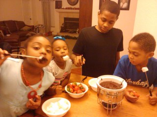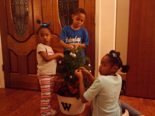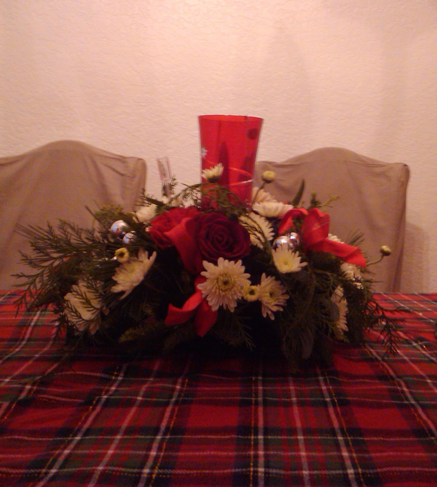 Saturday we dug out the Christmas decorations and decorated our little fern that sits outside the door as well as the Christmas Tree. Normally we have the tree up the weekend after Thanksgiving but Tori’s finals did not end until this week and she had no breathing room until they were over. As the kids get older and take on more responsibilities it will be hard to set dates to decorate. I have decided that we will start a new tradition next year of putting up the tree after Thanksgiving dinner while everyone is gathered together. I pulled out the fondue set and we had way too many marshmallows, pretzels and strawberries dipped in chocolate. That tradition is definitely a keeper. The beautiful centerpiece above was a surprise I got in the mail from my mom. She knows how much I love setting the table for the holidays. The room seems so warm and inviting with the candle lit and the fresh flowers make the room smell wonderful!